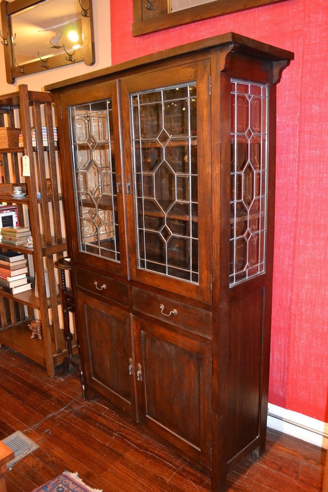 Oak secretary curved glass china cabinet, bev. mirror, claw feet, 74”h x 67”w Oak spool cabinet, glassed doors, 82’ h x 46”w Oak Hoosier-style kitchen cabinet, restorable 2 oak curved glass china cabinets, 60”h x 35”, newer John D. Brush & Co. floor safe, 20”h x 16”w ... Return Doc